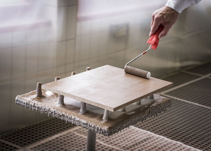 Een aanbevolen ondergrond voor het betoneffect zijn ruwe mdf-platen. Vóór het aanbrengen van de grondverf worden de oppervlakken geschuurd met een korrel van 150. Eerst wordt de Bluefin Pure-Concrete aangebracht (35 gewichtsdelen), die is afgestemd op een van onze zes standaard kleuren. Vermeng de Aquafix Concrete Natur (100 gewichtsdelen) goed, met een oplosmiddel of korfmenger, voor een perfect mengsel zonder klonters.