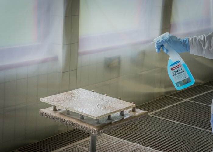 Het oppervlak met het nieuw gecreëerde betoneffect kan nu met een toplaag worden afgewerkt. Verzegel het oppervlak eerst met de Bluefin Primer-Concrete + 10 % Aqua-PUR-Härter (100 - 120 g/m2), die voorkomt dat het cement verkrijt bij waterbelasting. Laat uw werk nog eens 3 uur drogen en werk het ten slotte af met laag Aqua-Top Antiscratch met glanslaag G5 in een laagdikte van 80 g/m2 + 10 % Aqua-PUR-Härter.